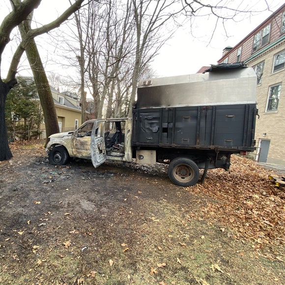 A landscaping truck removing leaves at 179 Summer St. was destroyed by fire. The fire also spread to a tree and leaf piles nearby. — Photo by Somerville Fire Department