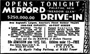 The drive-ins we went to the most were either The Meadow Glen or Medford Twin (Wellington). Remember driving up over the bumps to get a good spot close to the screen? How many of you actually hid in the trunk to sneak in? Back then, there was still a lot of space in the trunks of cars, even with a full-sized spare tire.