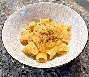 Preheat oven to 425°. Add the butternut squash, garlic, olive oil, salt, pepper, and zá atar to a bowl and blend well. Place the mixture onto a lined baking sheet and bake for approximately 20 minutes, or until fork-tender. Meanwhile, cook the pasta according to the package. Place the mixture into a food processor or blender along with the feta. Blend until smooth. It’s going to be really thick, so add some pasta water to thin it out a bit. You’re looking for a pancake batter consistency. Strain the pasta into a bowl and add about a 1/2 cup of the sauce to the pasta and toss until well coated. Split the pasta between 4 bowls, add the remainder of the sauce to each bowl, and garnish with zá atar and feta. Serves 4.