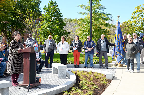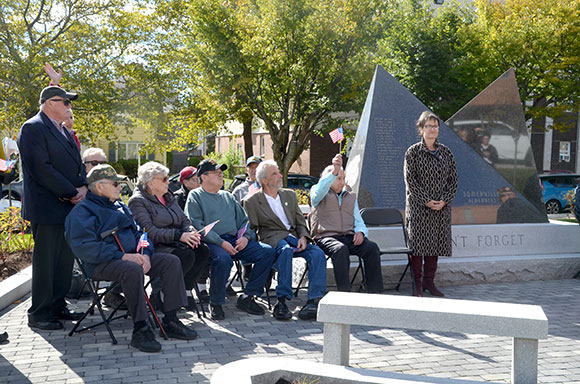 The ceremony, co-hosted by the Somerville Department of Veterans’ Services and Public Space and Urban Forestry Division, took place on Thursday, October 16, on the lawn in front of Somerville High School. The Central Hill Veterans Memorials restoration project was a component of the new Somerville High School campus design. Coming out of an extensive community process, the vision for the site includes a memorial walk with reflective spaces honoring veterans in chronological order. To learn more, visit voice.somervillema.gov/central-hill-memorials.