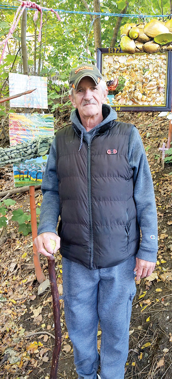 One day I got an email from the accomplished Somerville sculptor Ann Hirsch about a talented outsider artist – Robert Wright. She told me he has this strange but very compelling art on display in a little park in Gilman Square. On a crisp morning in October, I walked over to Gilman Square in Somerville to meet the man and view his art. It was a bit nostalgic, as the old Paddock Restaurant site was across the street, a place I used to frequent years back. Wright was walking with a friend of his, and I introduced myself. Wright told me that he is a resident of the Park Street Senior Center and started working on this art among a little warren of trees next to his residence. He revealed that he had once been an ironworker and was severely injured in a work-related accident, and since then, he had been looking to fill his time with something interesting.