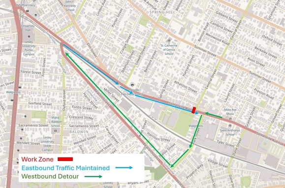 This work will require westbound (traveling toward Porter Square) motor vehicle traffic on Somerville Avenue to be detoured at Park Street.