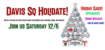 The Davis Square Merchants Association encourages residents and visitors to join in the first-ever Davis Square Holidate. Whether discovering one of our shops, enjoying a seasonal snack, or simply soaking up the neighborhood’s festive and funky atmosphere, attendees will experience the best of what Davis Square has to offer, while supporting local merchants during an important shopping season.
