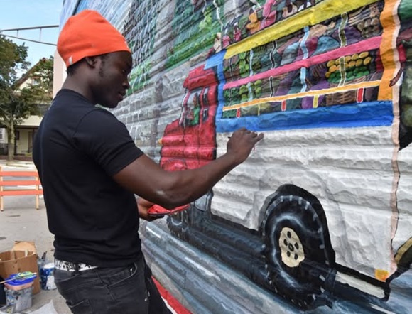 Pascal Michel painting his mural at Highland Creole Cuisine ~Photo by Greg Cook