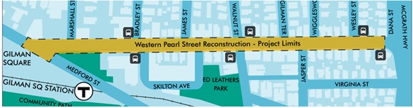 The City of Somerville is working to make the western segment of Pearl Street between McGrath Highway and Medford Street safer and more accessible by redesigning and reconstructing the street. The project will include improved crosswalks, new trees, protected bike lanes, better bus stops, and traffic calming on Pearl Street and in the nearby area.